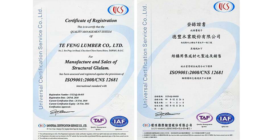德豐木業結構用集成材 通過ISO9001認證